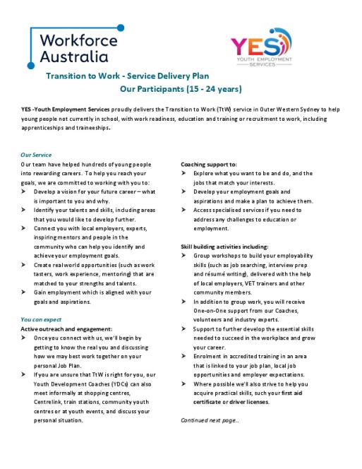 This is a Service Delivery Plan (SDP) for Transition to Work (TtW).